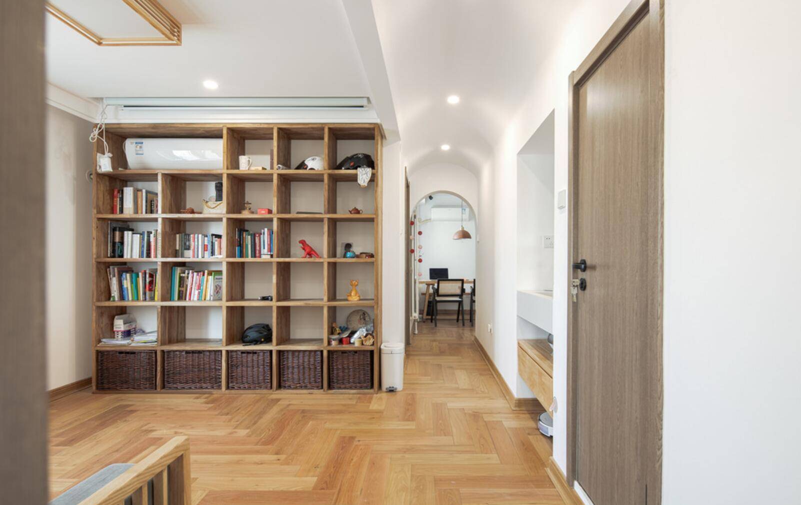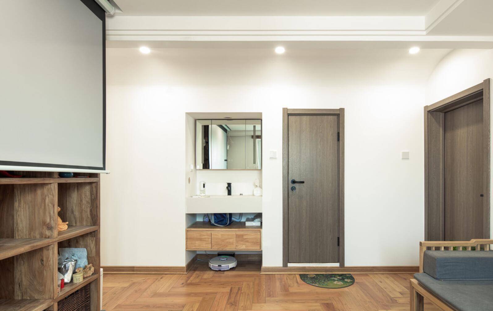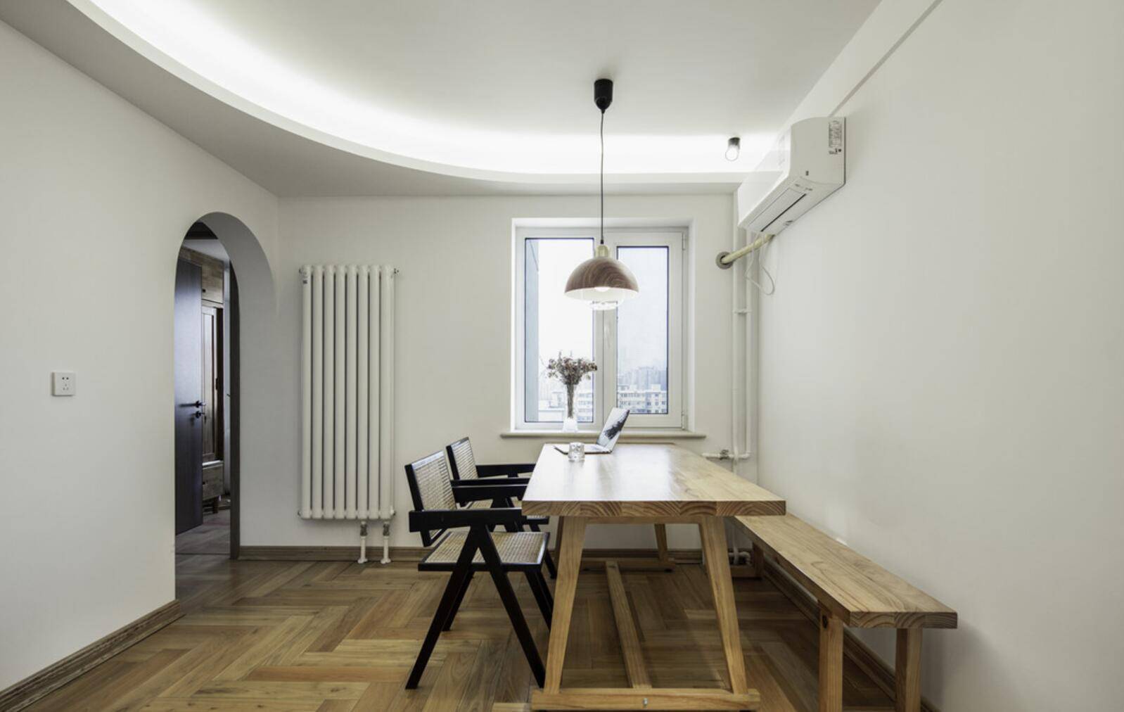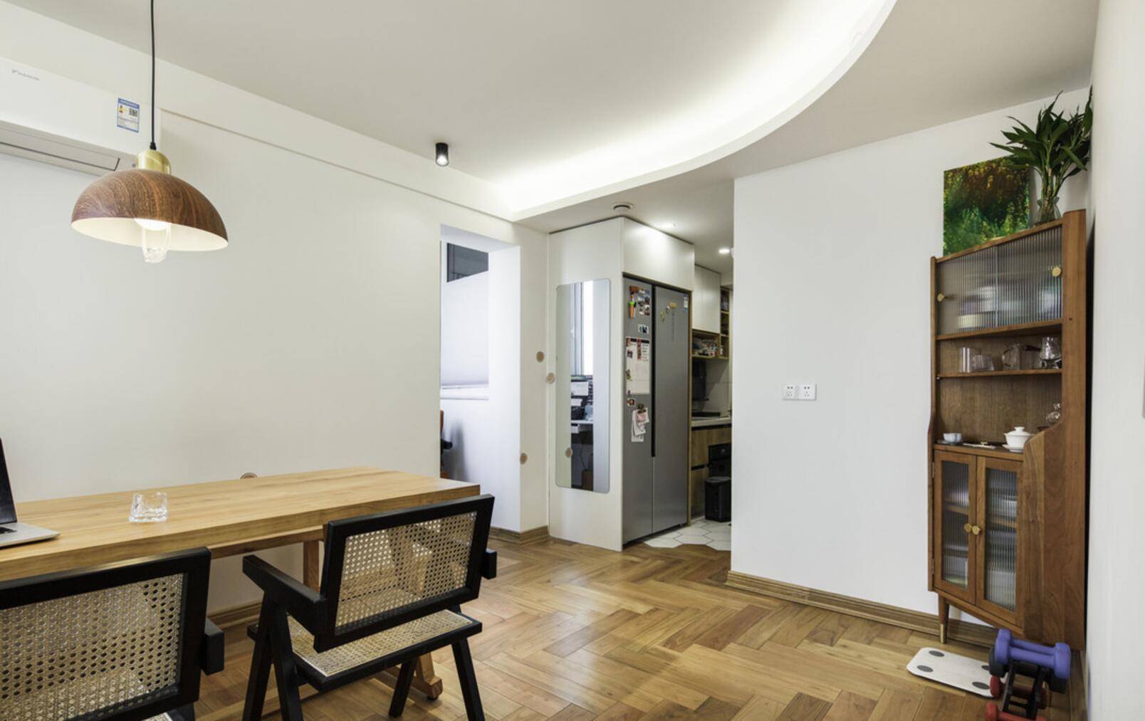 1.6米长的原木餐桌,不仅能满足六口人的用餐需求,还兼具手工、办公台的功能。而部分吊顶采用弧形设计,在提升空间美感的同时,还能遮挡新风管道。毕竟,小户型的通风环境优化至关重要。