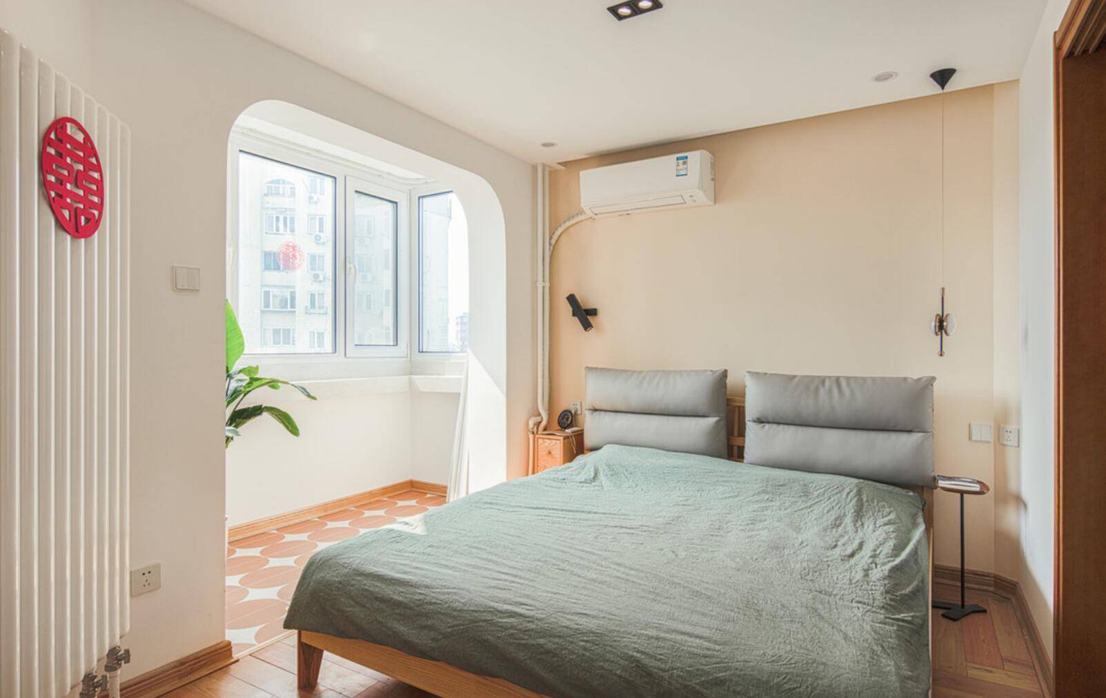 步入主卧,当旁边的衣帽间采用异形结构规划后,空间变得规整许多。床头墙面刷上米黄色乳胶漆,与旁边的白墙形成层次对比,加深了空间的氛围感。