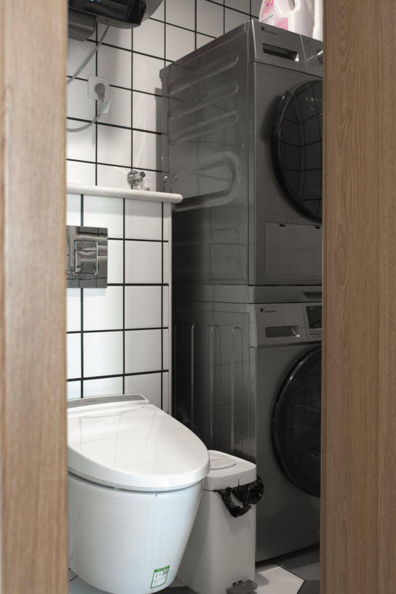 卫生间拆除内部无用的墙体后,将台盆柜移出。这样不仅提高了空间使用率,还使内部能够放置洗衣机和烘干机,从而释放了南阳台的面积。