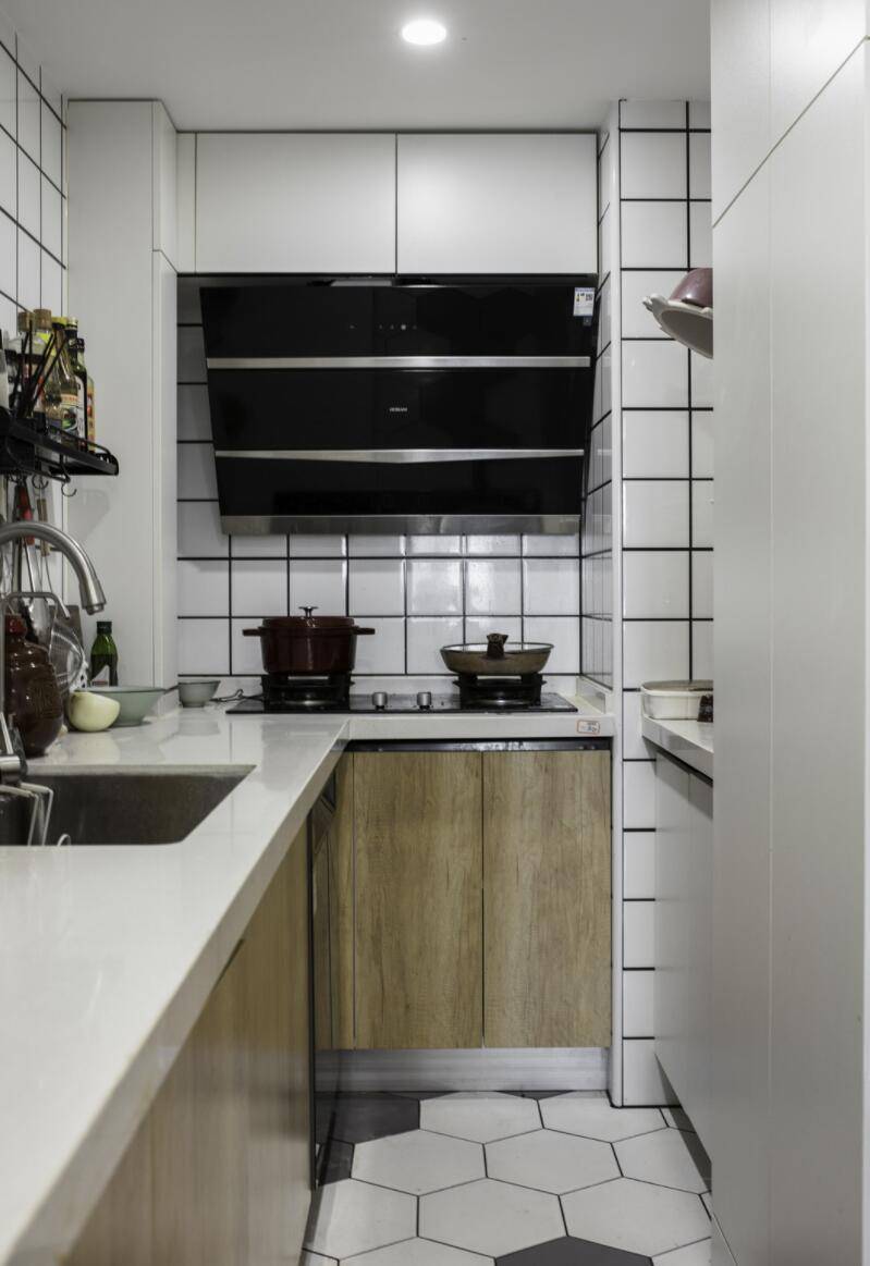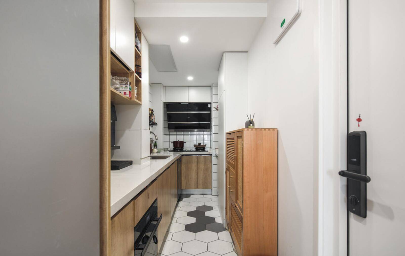 一进门便是厨房,位置虽有些尴尬,但空间利用丝毫不能马虎。于是,直接将橱柜延伸,并嵌入冰箱,不仅增加了厨房的收纳与操作面积,冰箱还起到了入户端景的作用。而入户的收纳需求,则通过旁边的成品鞋柜解决。