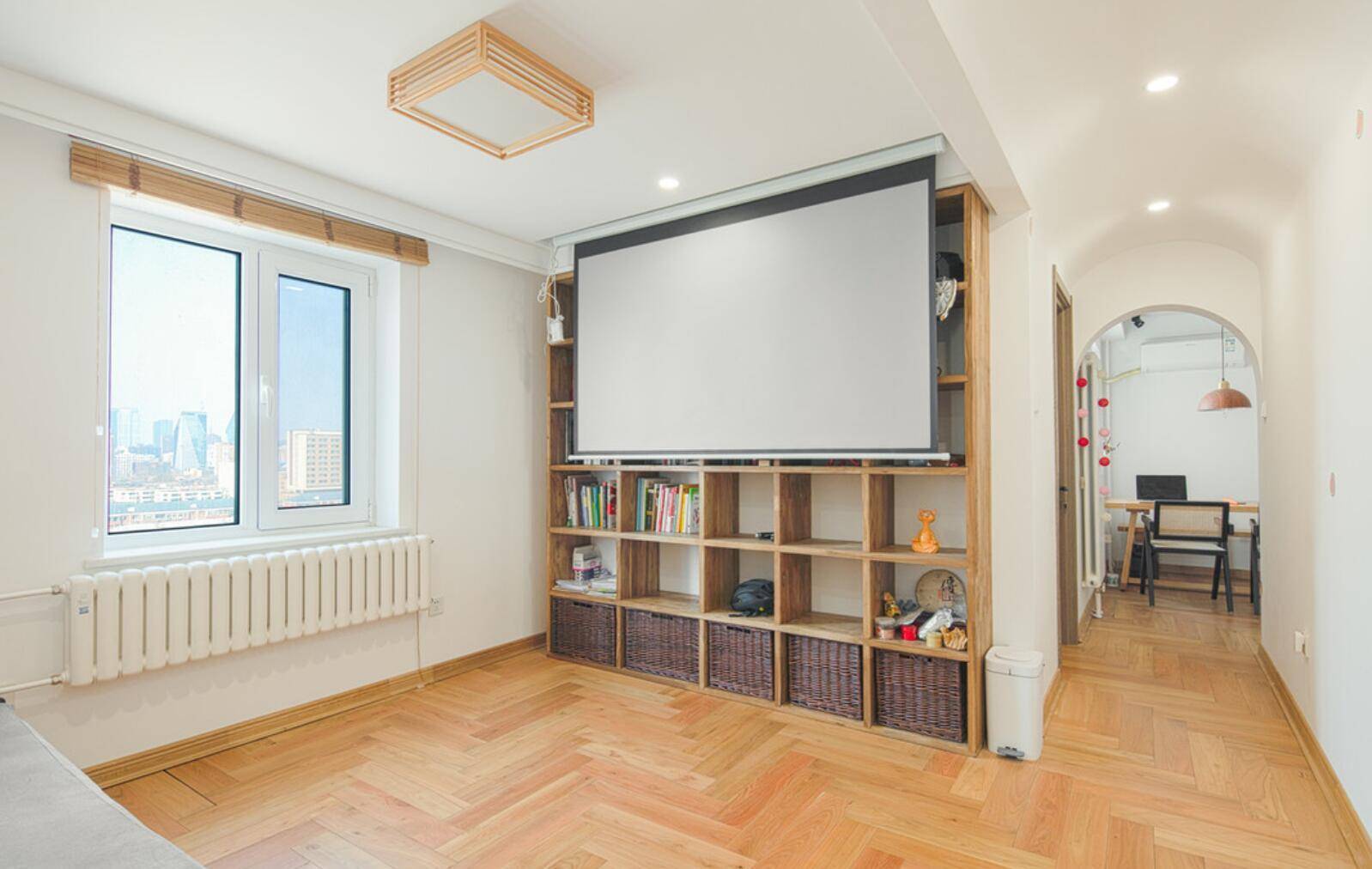 取消中间的卧室并改造成客厅,空间功能性瞬间得以完善。电视墙采用隔层架设计,完美融合收纳与展示功能。同时,将投影幕布暗藏在顶部,使用更加灵活。