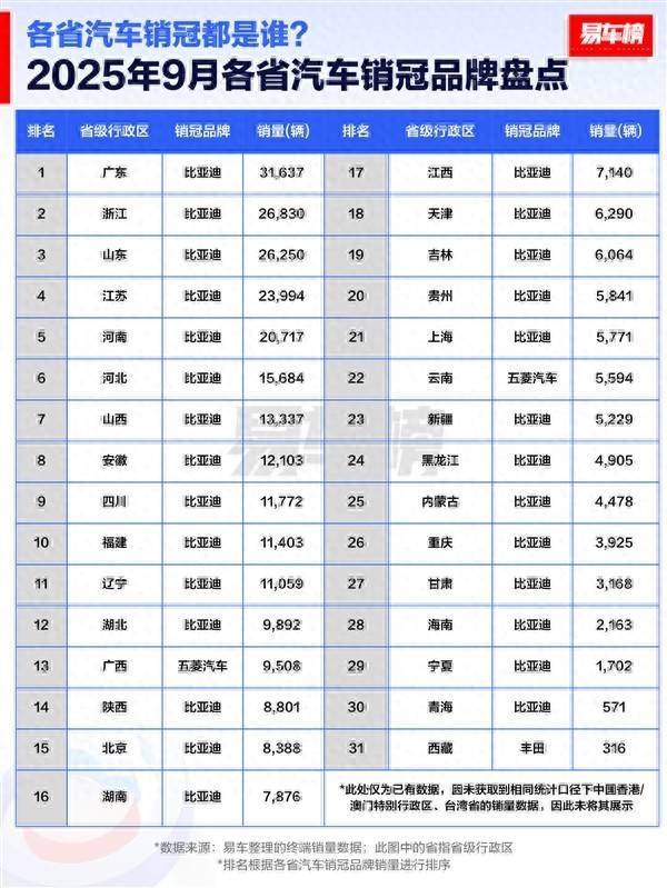对于河南打算购车的市民而言,每月汽车销量榜单往往是重要的参考依据。10月上旬,易车榜正式发布2025年9月全国各省汽车销冠品牌及车型盘点数据,这份榜单不仅呈现了全国汽车消费市场的整体趋势,更清晰揭晓了河南汽车市场的热门选择——品牌销冠归属比亚迪,车型销冠则由吉利星愿拿下。
