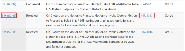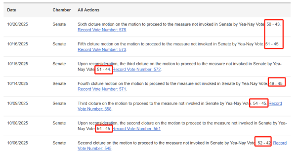 过去两个月,参议院对拨款法案的赞成票分别为:44、55、55、54、52、54、54、49、51、51、50票。相比9月中旬的40+票,10月份的赞成票已经达到50+。随着政府停摆导致的问题越来越多,预计参议院摇摆人士将很快做出“赞成”的决定。